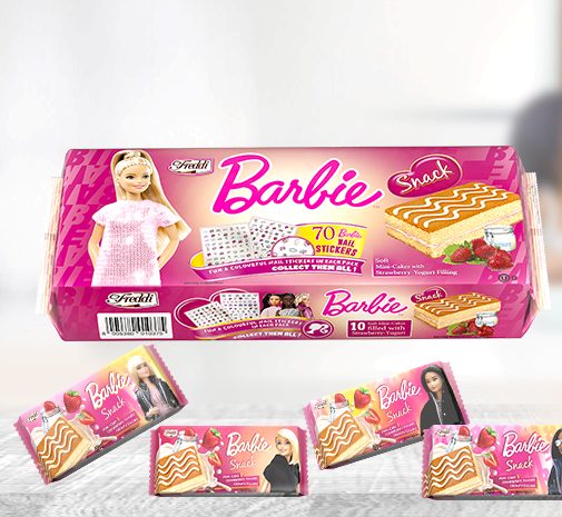 Barbie Snack: due strati di soffice Pan di Spagna e una farcitura delicata alla fragola e yogurt, per un prodotto morbido e goloso, con aromi naturali, senza conservanti né grassi idrogenati e con meno di 100 calorie.